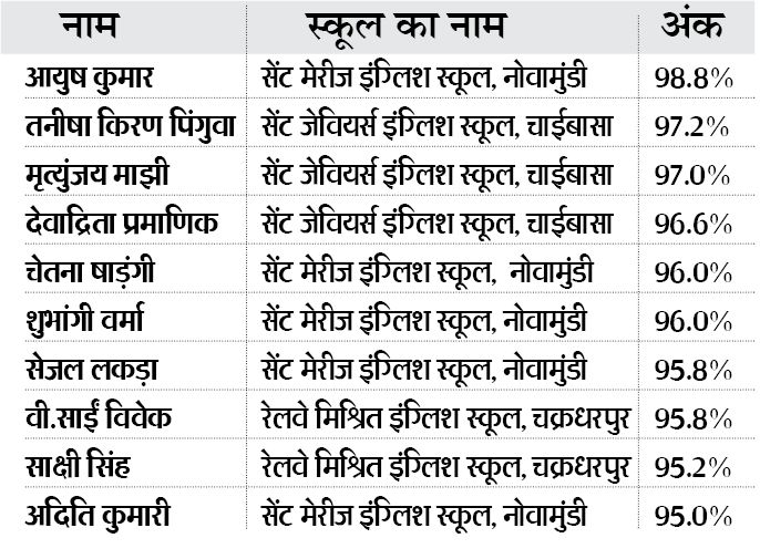 जिला टॉप-5 की बात करें तो सेंट जेवियर्स इंग्लिश स्कूल, चाईबासा के तीन विद्यार्थी दूसरे से चौथे स्थान पर रहे, जबकि सेंट मेरीज स्कूल