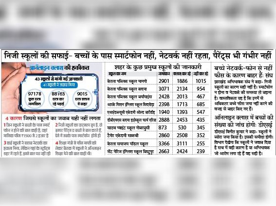 शहर के निजी स्कूलाें के 9015 बच्चे ऑनलाइन क्लास से वंचित हैं। यह जानकारी निजी स्कूलाें ने डीएसई कार्यालय काे दी। कार्यालय ने शहर के 43 निजी स्कूलाें से पूछा कि उनके यहां 12वीं तक कितने बच्चे हैं, कितने ऑनलाइन शिक्षा ले रहे हैं व कितने इससे वंचित हैं, इसका क्या कारण है। 43 में से 41 स्कूलाें ने जवाब दिया।