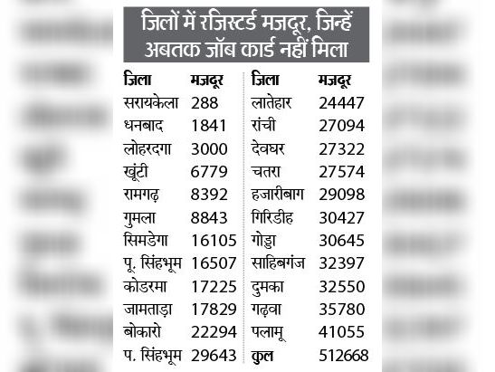 12 जुलाई 2020 तक के आंकड़े बताते हैं कि दुमका, साहेबगंज, गोड्डा, गिरिडीह जिले तो ऐसे हैं, जहां 30 हजार से ज्यादा ऐसे मजदूर हैं, जो जिनके पास जॉब कार्ड नहीं है। उल्लेखनीय है कि राज्य में लौटे प्रवासी मजदूरों को रोजगार देने के लिए मुख्यमंत्री हेमंत सोरेन ने तीन महत्वपूर्ण योजनाएं शुरू की हैं। इनमें नीलांबर-पीतांबर जल समृद्धि योजना, बिरसा हरित ग्राम योजना और वीर शहीद पोटो खेल विकास योजना शामिल हैं।