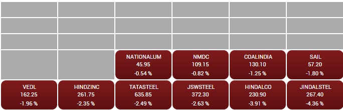 09:46 AM BSE मेटल इंडेक्स 2% नीचे कारोबार कर रहा है। इंडेक्स में जिंदल स्टील का शेयर 4.36% और हिंडाल्को का शेयर 3.91% नीचे कारोबार कर रहे हैं।