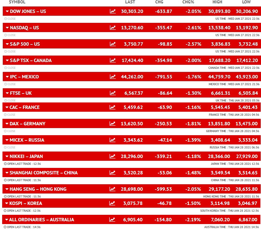 28 जनवरी को वैश्विक बाजारों में भारी गिरावट है। जापान का निक्केई इंडेक्स 1.23%, चीन का शंघाई कंपोजिट 1.50%, हॉन्गकॉन्ग का हेंगसेंग 2.16% नीचे कारोबार कर रहे हैं। इसी तरह कोरिया का कोस्पी इंडेक्स 1.55% और ऑस्ट्रेलिया का ऑल ऑर्डिनरीज 2.22% फिसल गए हैं। इससे पहले अमेरिकी बाजारों में भी भारी बिकवाली रही थी। डाओ जोंस, नैस्डैट और S&P 500 इंडेक्स 2-2% ज्यादा की गिरावट के साथ बंद हुए थे।
