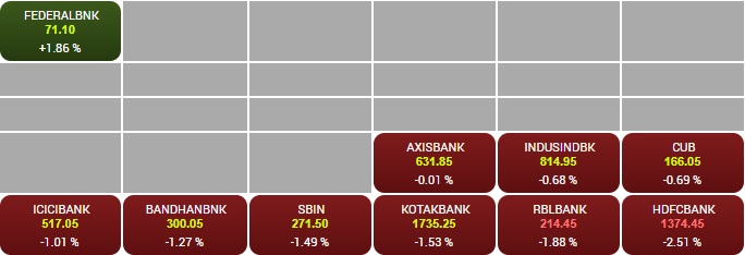 09:29 AM BSE बैंक इंडेक्स में 1.59% की गिरावट है। इंडेक्स में शामिल 10 में से 9 के शेयर गिरावट के साथ कारोबार कर रहे हैं। HDFC बैंक के शेयर में सबसे ज्यादा 2.51% की गिरावट है। वहीं, फेडरल बैंक का शेयर 1.86% की बढ़त है।