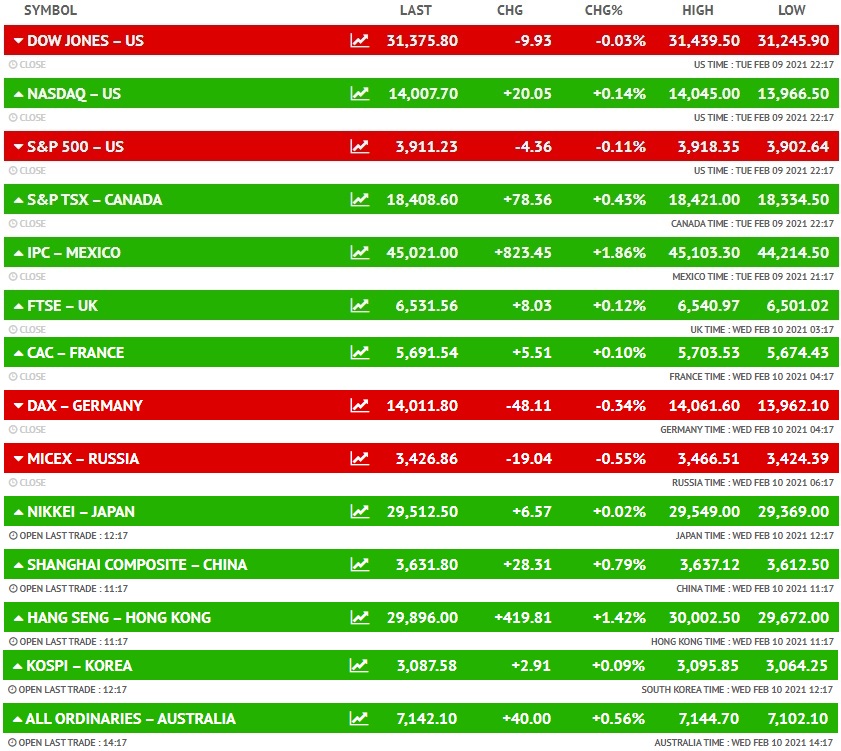 10 फरवरी को चीन का शंघाई कंपोजिट इंडेक्स और हॉन्गकॉन्ग का हेंगेसेंग 1-1% से ज्यादा की बढ़त के साथ कारोबार कर रहे हैं। जबकि कोरिया का कोस्पी इंडेक्स, जापान का निक्केई इंडेक्स और ऑस्ट्रेलिया का ऑल ऑर्डिनरीज इंडेक्स सपाट कारोबार कर रहे हैं। इससे पहले यूरोप और अमेरिकी बाजारों में भी सपाट बंद हुए थे।