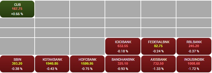 10:18 AM BSE बैंक इंडेक्स 149 अंकों की गिरावट के साथ कारोबार कर रहा है। इंडेक्स में शामिल 10 में से 9 बैंकों के शेयर गिरावट के साथ कारोबार कर रहा है। सबसे ज्यादा इंडसइंड बैंक और एक्सिस बैंक के शेयर 1-1% की गिरावट के साथ कारोबार कर रहे हैं।
