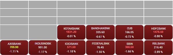 09:46 AM BSE बैंक इंडेक्स 303 अंकों की गिरावट के साथ 37,833 पर कारोबार कर रहा है। इंडेक्स में शामिल सभी शेयरों में गिरावट है। RBL बैंक का शेयर सबसे ज्यादा 2.9% गिरा है।