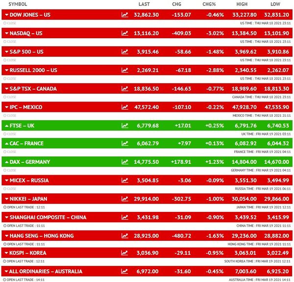 US अमेरिकी बॉन्ड यील्ड और यूरोप में कोरोना के नए मामलों में बढ़ोतरी से अमेरिकी शेयर बाजार में भारी बिकवाली रही। नैस्डैक इंडेक्स 3.02% गिरकर 13,116 अंकों पर बंद हुआ। S&P 500 इंडेक्स 1.48% नीचे 3,915 पाइंट पर आ गया। इसी तरह डाओ जोंस भी 153 अंकों की गिरावट के साथ 32,862 पर बंद हुआ है। इससे पहले यूरोपियन मार्केट हल्की बढ़त देखने को मिला, जिसमें फ्रांस, ब्रिटेन और जर्मनी के शेयर बाजार शामिल हैं।